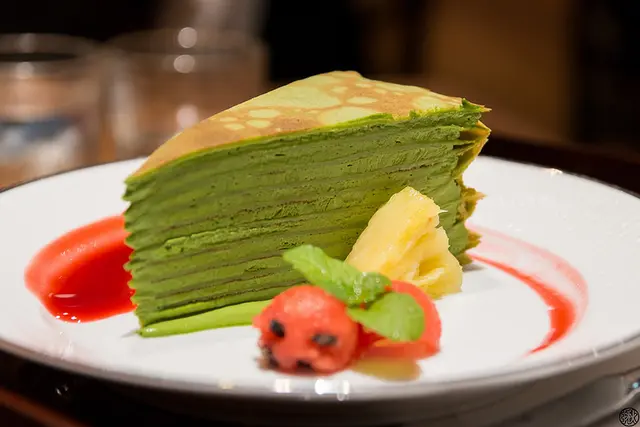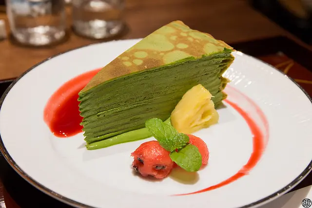 抹茶醬分布整齊,派皮約略有咀嚼感,切下時,層層的抹茶會滑落倒塌,但這食用上的小困難並不會影響個人對此款千層派的喜好。