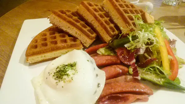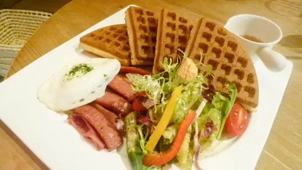 熱狗和培根煎得香脆,鬆餅吃起來很像雞蛋糕,帶有微甜的香氣。