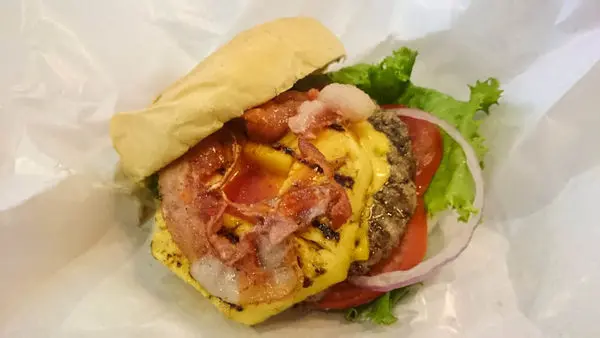 這個堡有很豐富的內容物 : 培根、鳳梨、雙倍起司(另加20元)、牛肉、番茄、生菜以及紫洋蔥。