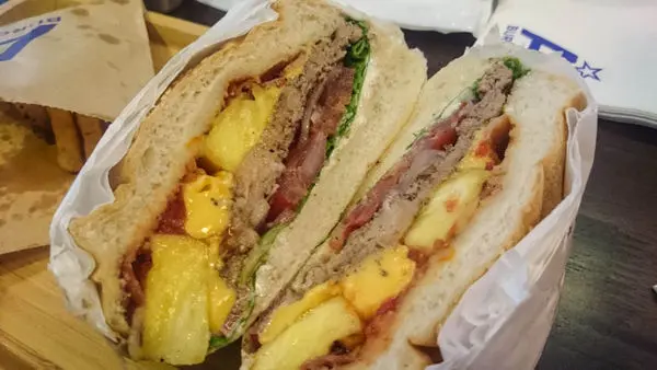 夏威夷堡就小一些,但同樣有著飽滿的內餡,店家會幫忙切成兩份,可以看到誘人的新鮮食材在向我揮手。