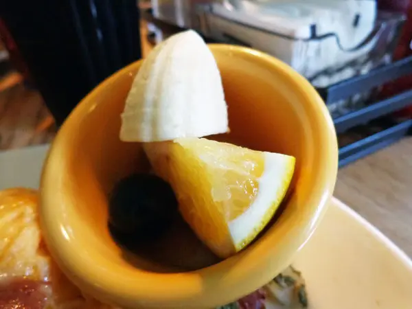 擺盤十分好看,紅色、黃色、小麥色、咖啡色再加上一小盅水果,配合光線也太美麗了!!