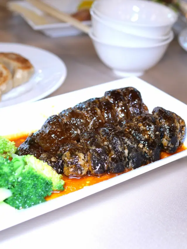 招牌脆皮烏參先滷後炸再煨煮,脆中帶黏,煮汁卻非喜愛的味道,