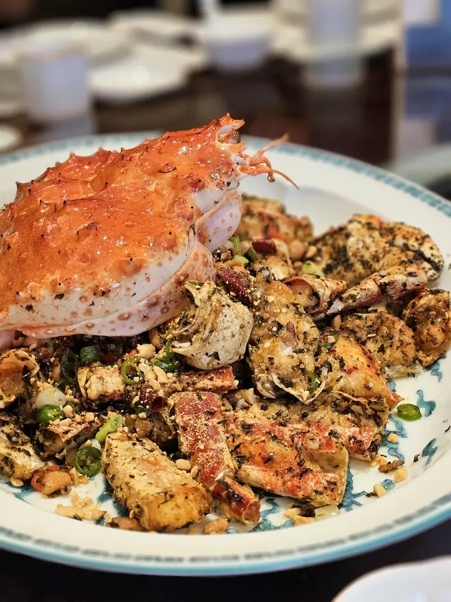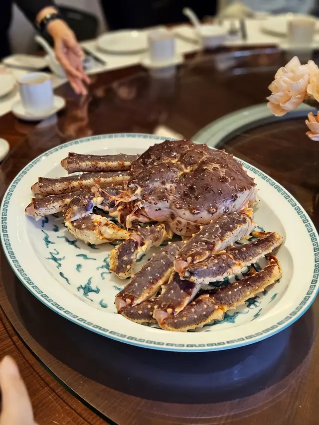 料理前取活體帝王蟹到桌上活動一下,是有誠意的演出了,芽菜炸過香味極好、味帶麻,