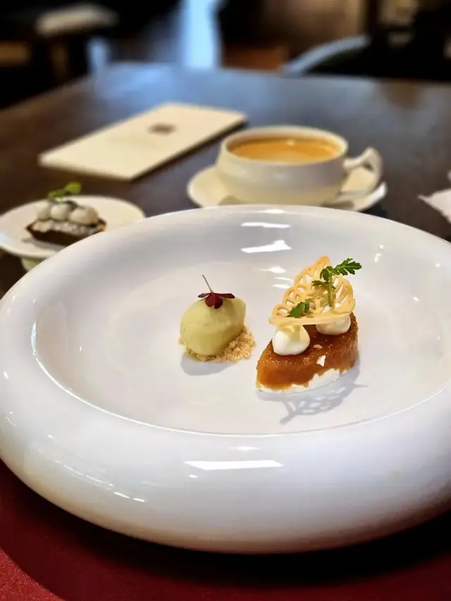 焦糖蘋果起司+青蘋果雪酪、紅玉紅茶,是簡單好吃的甜點,還附茶點費南雪奶蓋