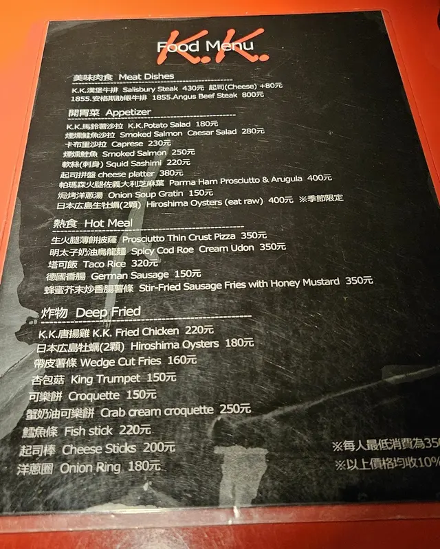 [食記] 台北-K.K.餐酒館 三高吃漢等級62024-03-31136 瀏覽 關注 拖了很久第一次造訪,漢堡排比我想像中優質許多,是全牛肉的~肉香充沛, 洋蔥量放得不少,鬆軟與扎實間的拿捏、醬汁調配..等,皆蠻對我胃口, 是一時之選的漢堡排,附上煮得ok的白飯,確實可以吃得蠻開心。(季節的百香果Mojito,酸甜味很夠,女生應該愛,但整杯份量很少)(vodka lime,第二杯隨意點經典款試試,酒感偏重..不是我喜歡的平衡度)(蜂蜜芥末炒香腸薯條,涮嘴的調味,半月薯能再脆些就更好了)(KK漢堡牛排+起司,肉餅表層也加強得不錯)以上食記乃用戶個人意見,並不代表OpenRice之觀點。讚好分享[食記] 台北-K.K.餐酒館 K.K.餐酒館 https://s.openrice.com/cHRTm021yk100檢舉 張貼 評分4味道4環境4服務3衛生4CP值用餐方式內用