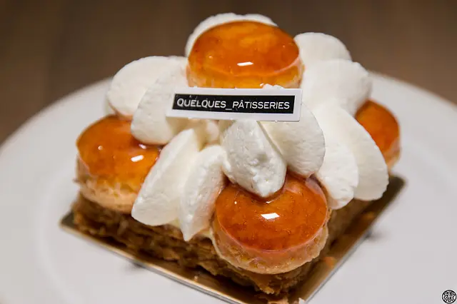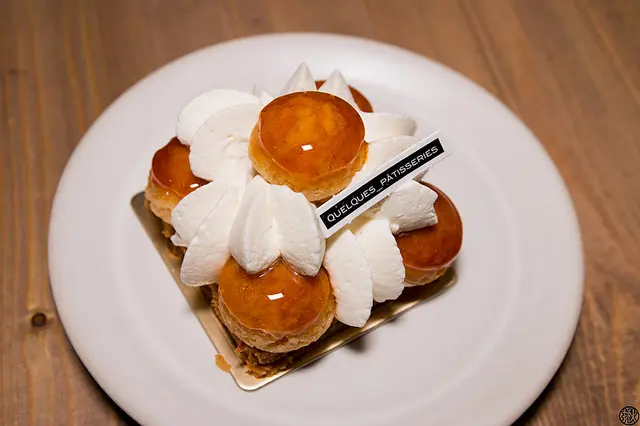 柔滑的奶油與卡士達,遇上酥脆的糖片和千層,在嘴裡交織出奇妙的口感及滋味,具有香氣的焦糖片意外勾起對卡通麥芽糖的兒時回憶,是款令人歡樂完食的甜點。