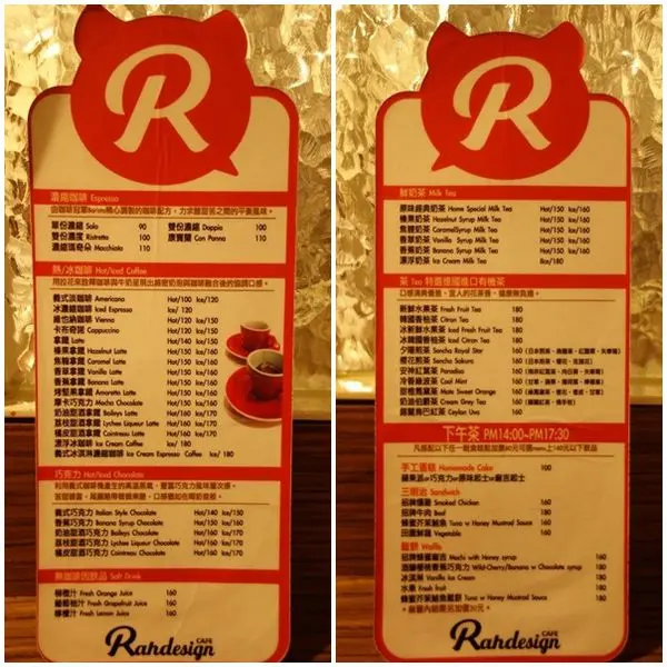 我們到Rahdesign的時間是下午,所以店內提供的是下午茶餐點,點任何一款下午茶的料理(蛋糕、三明治、鬆餅)加80元就可以享用140元以下的飲品,超過這個金額只要補差價就可以。