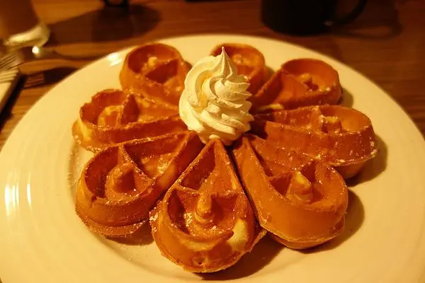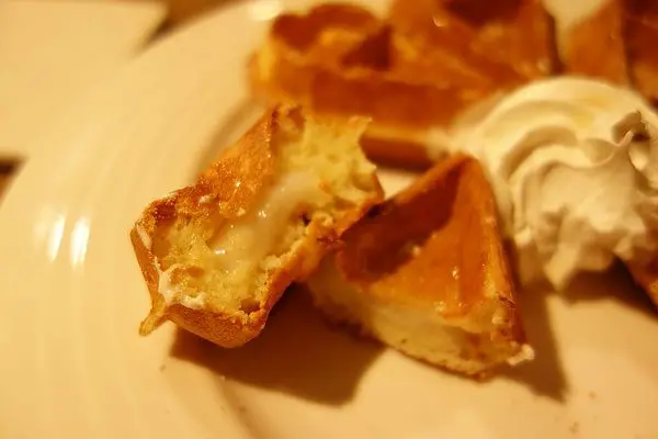 搭配甜甜摩卡巧克力的是招牌蜂蜜麻吉鬆餅,雖然名字有蜂蜜兩個字,不過不會太甜,反而鬆餅上裝飾的奶油還比較甜。麻吉被夾在水滴形狀鬆餅的邊緣,剛端上桌還熱熱的鬆餅吃起來真的超好吃,外脆內軟還加上QQ的麻吉,難怪店裡有不少人點這道下午茶。