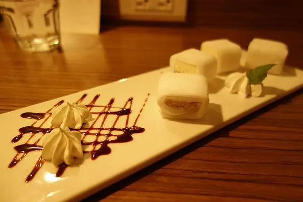 我覺得大廚點的東西裡面比較特別的是手工麻吉起司蛋糕,一開始我還以為是起司蛋糕的外觀裡面加入麻吉,結果讓我意外的是,它竟然是用大福的那種外皮包住起司蛋糕,實在是滿特別的。小缺點就是剛端上來的時候起司蛋糕凍的有點硬,很難用叉子戳起來吃,放到嘴巴裡也很難咬,大概要過10-15分鐘等起司蛋糕稍微軟化一點比較好吃。
