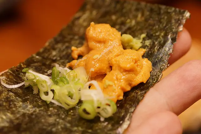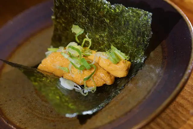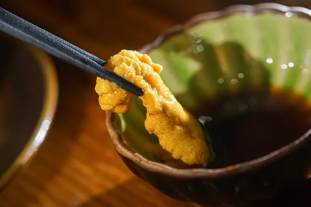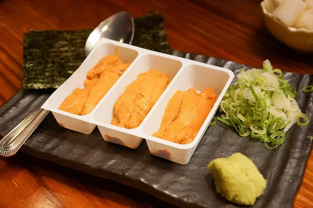 巧妙的中和了海膽的濃郁氣味 並且口感上更為豐富 最推薦這種吃法喔!