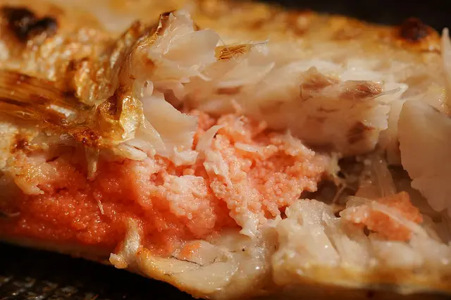 店家在燒烤馬頭魚前 會先在肚內擠上明太子
