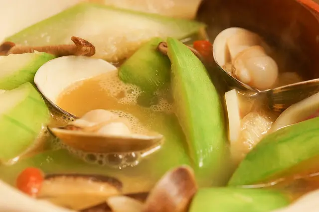 翠綠的絲瓜 飽滿大顆的蛤蜊 加點香菇及枸杞