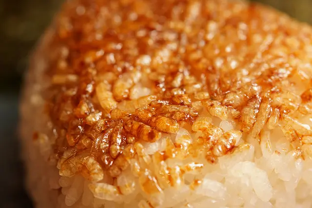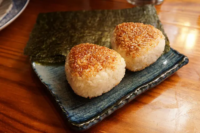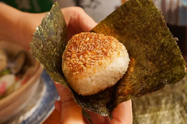 刷上日式醬油後 小火細心的烤至三角飯糰外層米粒脆硬