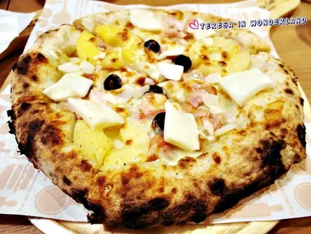 燻雞經過窯燒後,煙燻味更為誘人~搭上酸酸甜甜的鳳梨,口感為之清爽!好開胃的一個Pizza xDDD