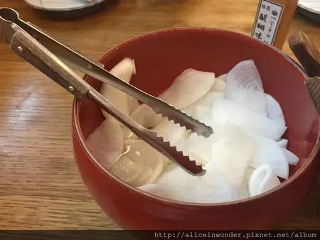 隨桌附上去油解膩的小菜:薑片及醃蘿蔔