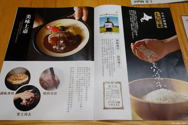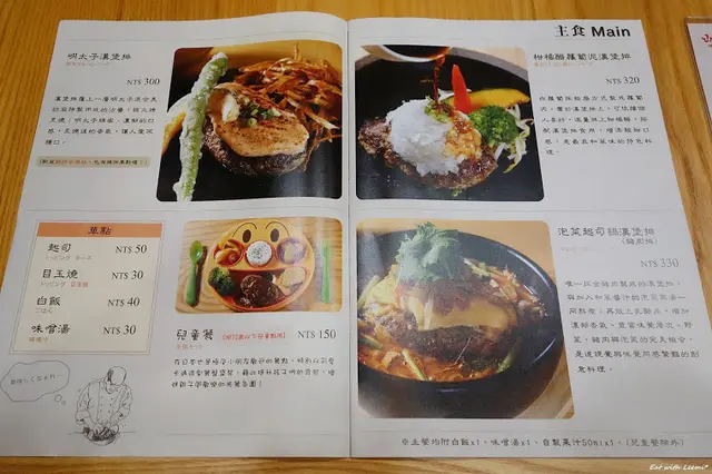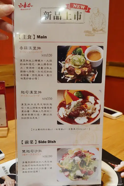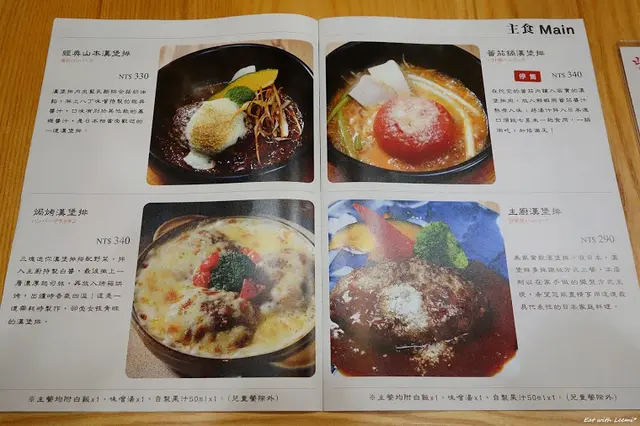 開幕才兩個月左右Menu上就出現整排停售,其中還包含那週才剛被蘋果日報介紹到的幾樣菜色,這裡的漢堡排都是套餐型態供餐,價位在300上下,內容包含主菜和一碗飯、一碗湯、一小杯果汁,並沒有加價升級的選項,需收10%服務費,有用餐時限1.5小時,服務方面態度很好,不過有些規定可能需要在衡量一下是否能符合各種情況,比如在過了用餐尖峰期、現場沒客滿、晚點也不太可再出現人潮的情況下,以用餐時限為理由拒絕客人加點。