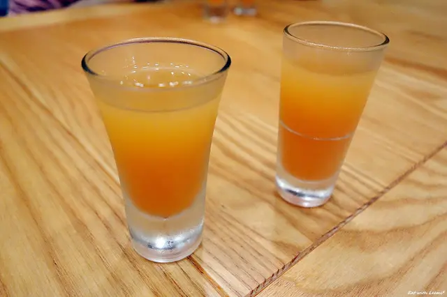 主餐上桌前先送來的小杯果汁,容量是50ml,大概兩口喝光的份量,味道還不錯,是帶點胡蘿蔔味的野菜果汁。