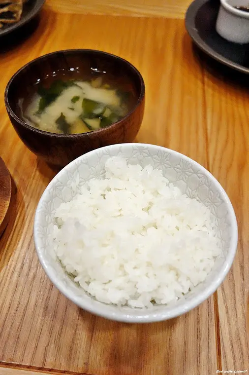 這裡採用精米商三代目俵屋玄兵衛所供應的北海道七星米,故套餐白飯不可續碗,只提供單點每碗40元,不過說實話米飯的品質並沒有跟上價格,來訪時剛好碰上優惠活動故加點只需半價20元,勉強還能接受,總之如果要當作賣點的話,可能烹煮或保溫的方式需要再加強,因為吃起來和日系連鎖定食可以無限量供應的米飯相比反而還差一點,在知道使用的原料品質不錯的情況下更讓人感到詫異,至於味噌湯挺普通,沒有特別出色。