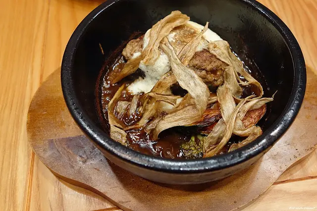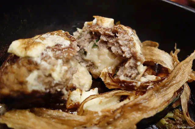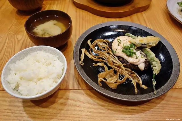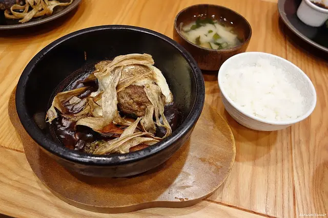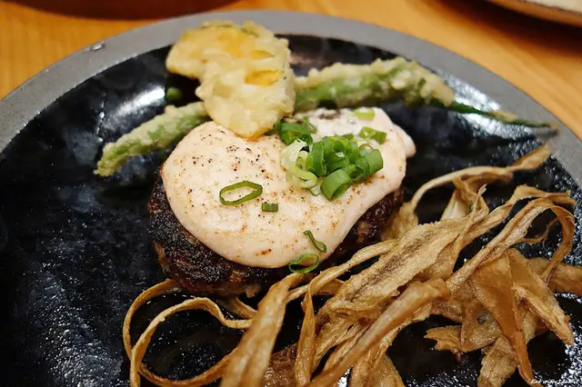 漢堡排內夾入藍紋乳酪製成的奶油餡,但如果不是事前知曉的話並不會特別注意到這點,因為嚐起來的味道很溫和,沒有平常藍紋乳酪給人氣味濃烈的那種印象,用八丁味噌特製的淋醬加上石碗高溫加熱後多了點焦香,整體來說前一兩口覺得頗出色,但吃到後頭味覺疲乏的也很明顯,搭配的炸牛蒡也帶來的負擔感