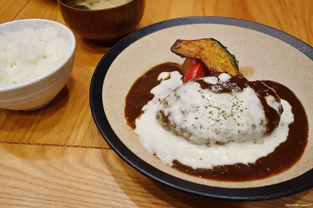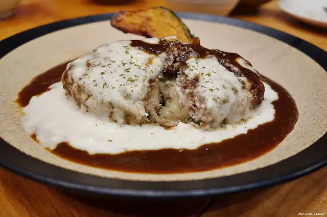 和招牌漢堡排相同的元素是夾餡的起司和外頭淋的味噌醬,不過整體呈現方式較為溫和,裏頭的是風味清淡口感柔潤的mozzarella,味噌則藉由白醬添了幾分溫婉,是相對更大眾口味的一款。