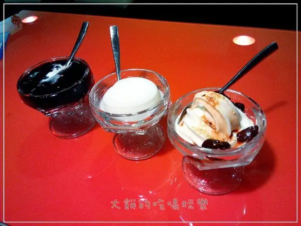 服務人員一次端上了三種甜點 分別是手工嫩仙草..杏仁凍及霜淇淋