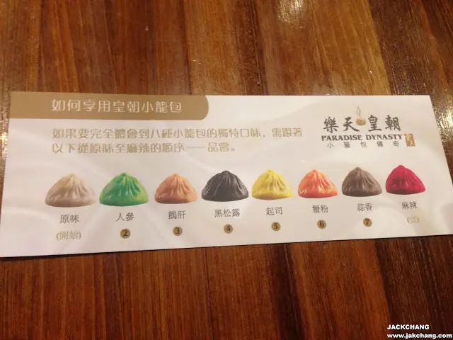 八色小籠包包括原味、人參、鵝肝、黑松露、起司、蟹粉、蒜香以及川麻