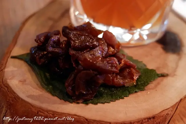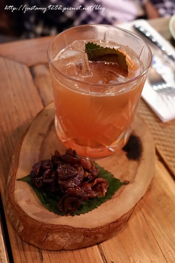 之後服務生便把紫蘇葉&香橙果乾一併放入酒杯裡
