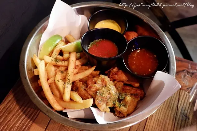 內容物有:薯條、洋蔥圈、雞翅、南蠻炸雞