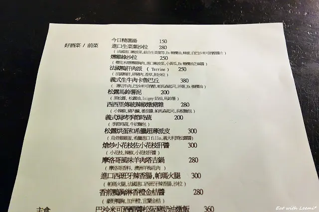 菜單的部分就單面一張紙,分成前菜和主食,再加上一些寫在黑板上的當日限定,另外有飲料單,甜點則是看當日冷藏櫃裡有什麼,不過沒有標品名價格,要自己開口問。