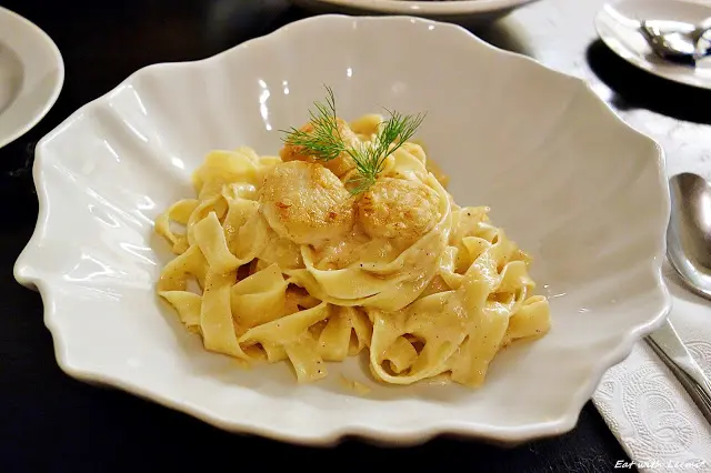 寬麵口感不錯,但搭配的明太子奶油醬汁味道頗清淡,且鹹度也略微不足會讓人覺得是需要配其他料理一起食用的主食,幾乎感受不到明太子的味道,份量稍多些適合多點幾道主餐來一起分食,干貝料理得蠻好吃的,鹹鮮滋味加上軟彈口感挺不賴,味道比起底下的麵條要好上許多。