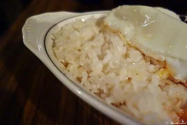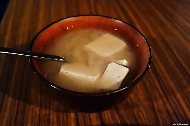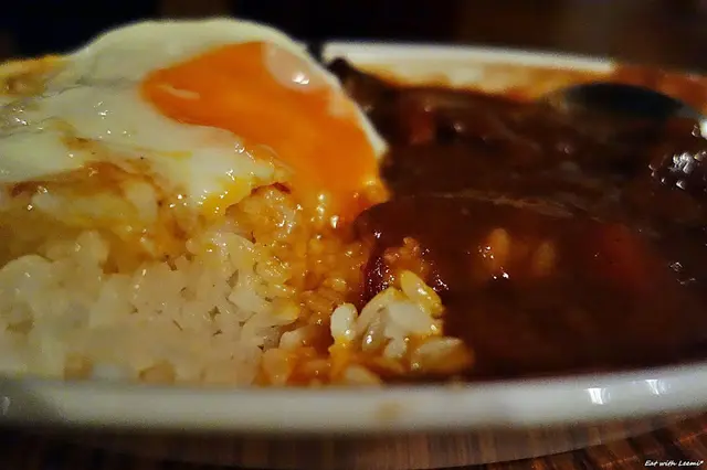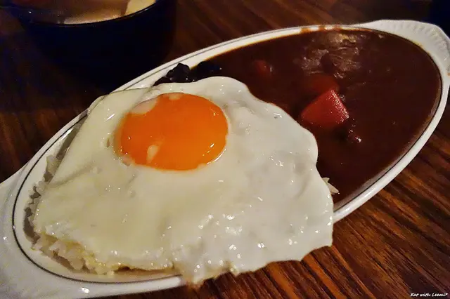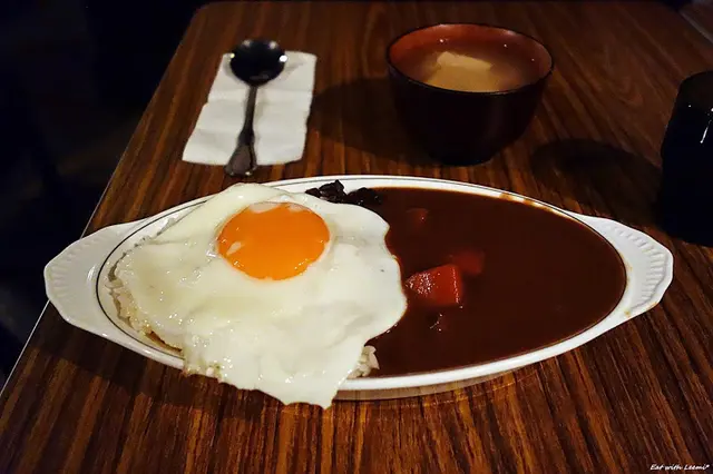 這回點的牛肉咖哩果然合味許多,有感的辣度配上較為稠郁的醬汁,雖不到驚為天人,但也恰如其分地成為白米飯相親相愛的夥伴,和雞豬咖哩相比,這醬汁也較有燉煮料理的濃厚風味在,牛肉塊也沒那麼柴,對我而言吃咖哩必定配帶有口感的米飯,這裡的白飯還可以,不至於濕軟,另外加價點了半熟荷包蛋,劃開讓蛋黃流洩而下,混合著咖哩醬汁吃又是另種圓潤的風味,單點的味噌湯倒是普通,料也僅是幾塊豆腐,可點可不點。