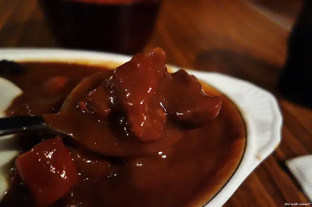 那次到訪雖是平日,晚餐時間和朋友一起候位還是等上了40分鐘,才進門坐下便聽到自己想吃的牛肉咖哩剛售完一事,是有點失望,朋友們都點了豬雞咖哩,而我的一臉苦瓜大概表露的太明顯,店員也主動提議一些替代方案(例如用很優惠的價格提供無肉的牛肉咖哩醬汁配白飯),不過並不符合自己的需求,問了老闆低消,得到客氣回應說明店內沒有規定,但既然佔了位就該消費,最後決定點個飲料,我的這杯老虎巧克力帶著辛香料氣息,少了甜膩感,是風味獨具的巧克力熱飲,試了朋友的豬雞咖哩,肉塊略柴,醬汁偏甜且無辛辣感,確實不是自己喜歡的口味,同桌也點了搭配通心麵的組合,口感比預想的還不合拍,看來吃咖哩配白飯久了已經成為習慣。