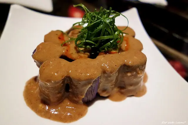 上頭的醬料是帶辣的蒜泥麻醬,鹹香開胃,配上冰涼的茄子口味還挺好的,我想這醬汁拿來做涼麵醬應該也很適合。