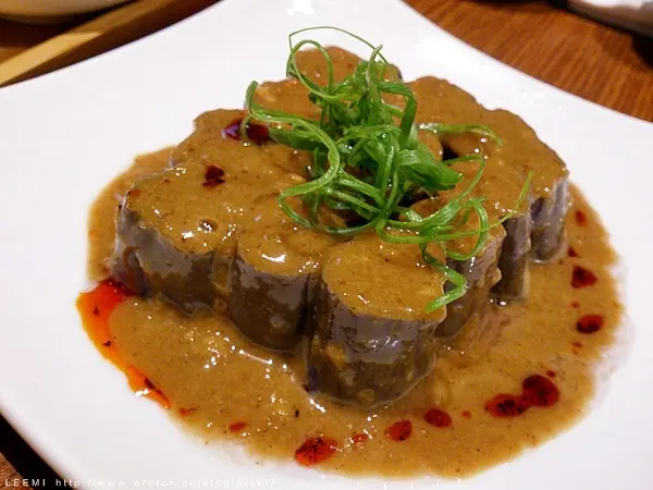 另一道涼菜茄子配的是蒜香麻醬,外加淋了點紅油,一口吃下滋味似曾相似,和涼麵醬的配方是有些相同之處,但蒜香與麻醬香都要更搶眼一點,配黃瓜應該也是不錯的組合?因為調味蓋去了茄子本身的味道,所以若是平日不愛吃茄子的朋友倒是可以嚐試看看這品,或許接受度會高點。