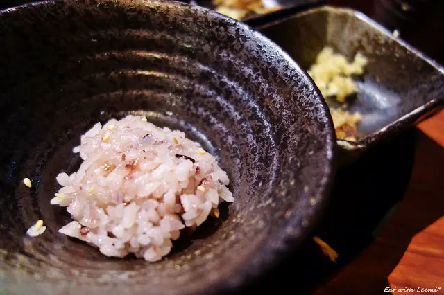 最後每份沾麵還會附上一小碗紫米飯,是用來將剩下來的沾汁加入做成湯泡飯的,同時也附上蒜片油蔥及高湯可以調整口味與濃淡,還好米飯份量只有一小口,因為我們吃完叉燒飯和沾麵以後飽到不行了。