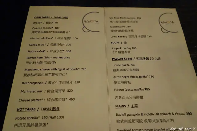 其實這天原本想吃串燒的,無奈跑去市民大道上的串鳥和吳留手詢問都要等待2小時以上,後來改往延吉街方向覓食,在HongKong茶水攤那條巷子裡發現了La MESA這間餐廳,主要供應的是西班牙菜,上回的西班牙小酒館讓我對類風味料理有不錯的印象,今天就換個地方試試看口味如何囉。