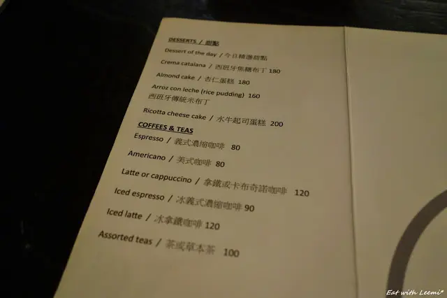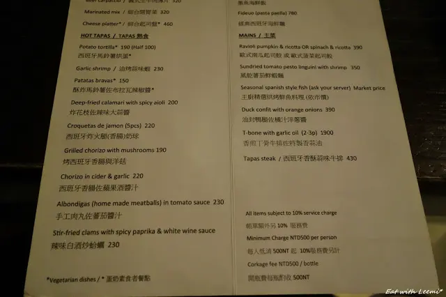 這裡供應的菜色其實不僅限於西班牙料理,還可以看到許多異國菜色的身影,不過只有提供單點,並沒有其他的套餐組合,加上有500元的低消又另計10%服務費,整體消費不低,除了紙本上的內容外黑板及立牌也有不少推薦菜色,幫我們點餐的服務人員態度很好,對有興趣的餐點也會多做介紹,用餐中途也主動幫忙換上乾淨盤子,感覺很不錯,原本還想點個西班牙鍋飯,可惜份量較多怕吃不下其他菜只好先作罷。