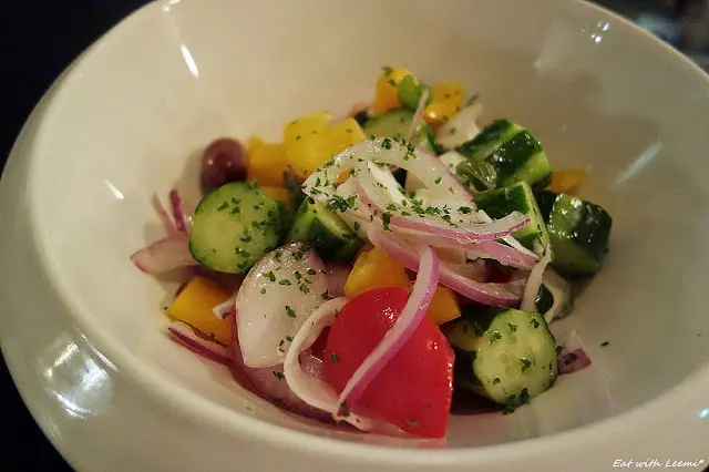 明明是到西班牙餐廳,但問過服務人員後選了我們決定選比較有特色的希臘沙拉,搭配的是油醋醬汁,很清爽的口味,蔬果都切得夠大塊,是比較有口感的沙拉,其中比較特別的是羊奶起司(Feta),風味很強烈,單吃覺得口味太重,和其他食材一起會比較好入口。