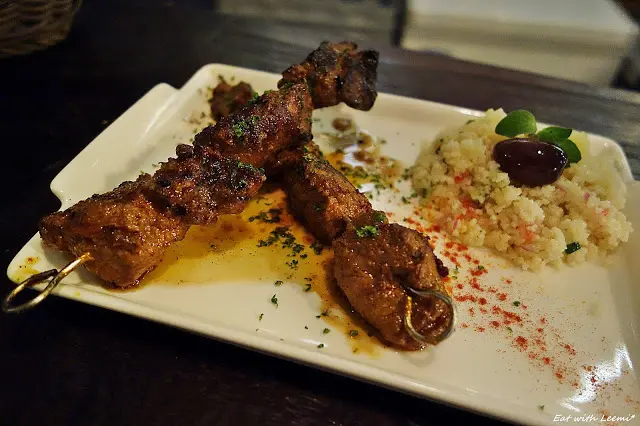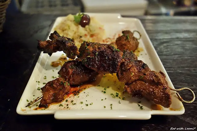 吃不到串燒那來個帶異國風味的烤羊肉串也不錯,上桌時氣味頗吸引人,羊肉較結實有嚼感,但肉本身羊臊味較強烈,雖然加了很多香料還是無法完全蓋掉,喜好此道的食客也許會喜歡,但我個人就不是這麼習慣了,旁邊附的是couscous(通稱北非小米,不過原料其實是粗麥粉)做的沙拉,滋味頗清爽,和風味較重的烤羊肉配在一起平衡口味的效果倒還不錯。