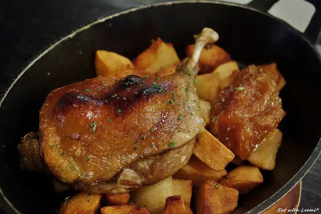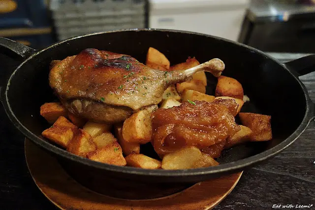 La MESA的菜單融合了各國特色,像這道油封鴨其實在法國傳統料理中更為出名,輕輕用叉子一播即可骨肉分離,鴨肉柔軟可口,表皮部位的油香與脆口更是美味,一旁的洋蔥熬至焦糖化,充分釋放甜味,柑橘果香吃的到但不明顯,墊底的薯塊表皮處裡很乾爽,還不錯吃,但量給的非常多,比重遠超過主角的鴨腿。