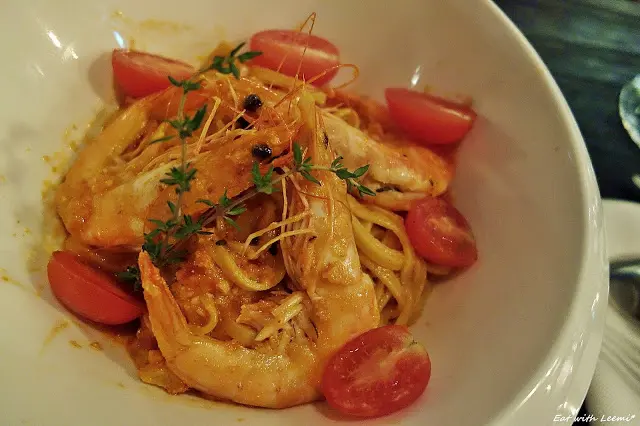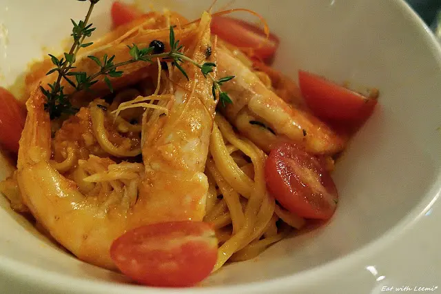 醬汁是用風乾蕃茄打碎製成,味道比起生鮮番茄更為濃縮,其中還加了一些堅果類更添風味及口感,調味下的不重,主要還是靠食材原本的滋味,我個人習慣吃重口味,會希望這盤麵再鹹一丁點,感覺這樣搭上蕃茄的酸香會比較過癮,不然就是建議多人分食一份,不會吃到後來味覺疲乏覺得少了一點什麼,蝦子只有三隻但個頭大有新鮮吃的頗開心,而且已經有開背處理過了剝殼不是太麻煩,不過其中一隻腸泥沒完全清乾淨,細扁麵比較可惜一點,雖不至於到軟爛的程度但少了些我愛的彈牙口感。
