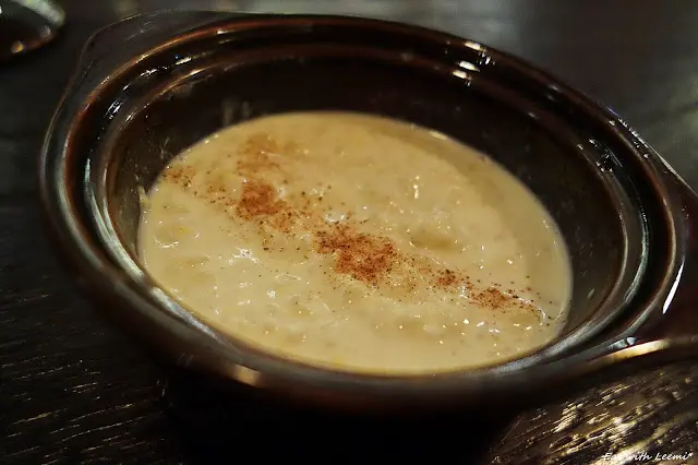 用迷你鍋裝著的是米布丁,這是我第一次在西班牙餐廳點這道傳統甜點,所以也不清楚是否接近正統道地,不過口味我很喜歡,米粒帶點顆粒口感,醬汁又稠又密奶香十足,上頭加了點肉桂增香,像是甜點版的奶油燉飯,雖然這樣形容有點奇怪但其實蠻好吃的。