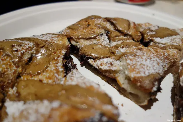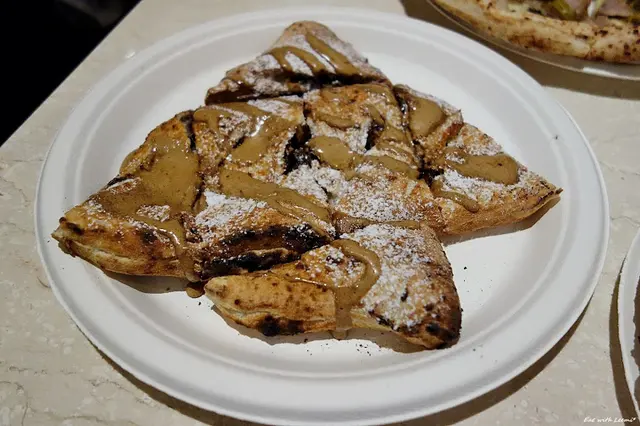 披薩餅皮包入了個人喜歡的Nutella巧克力醬,再加上咖啡糖漿與糖粉,這是一款眾人都嫌膩但自己卻吃得很開心的甜披薩,巧克力的濃甜之中還有咖啡香提點,趁熱吃風味是很不錯的,不過因為餐點完成的速度很快,若和其他鹹食一起上桌又擺到最後才吃,那餅皮的口感影響差距還不小,趁熱享用是上策。