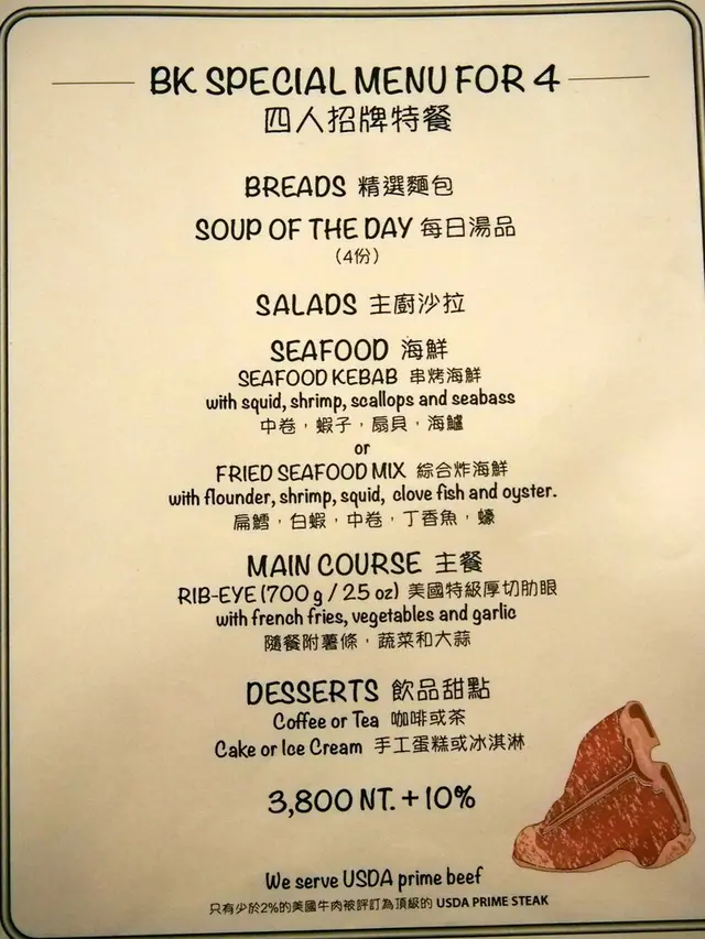 我們今天6個人,點了四人美國極黑牛戰斧套餐,還有單點其他菜色。點到大約2公斤的戰斧牛排,這是以公斤來計費的。光是牛排就$7,000了。加$1,200還有一成服務費,來這邊要有砸大錢的心理準備。