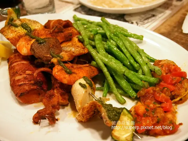 套餐附的烤海鮮(中卷柔嫩,蝦子可口,還跟菇類和其他蔬菜和鱸魚一起烤。整盤香氣逼人,而且烤的火候拿捏的很棒,沒有過老,大推!)