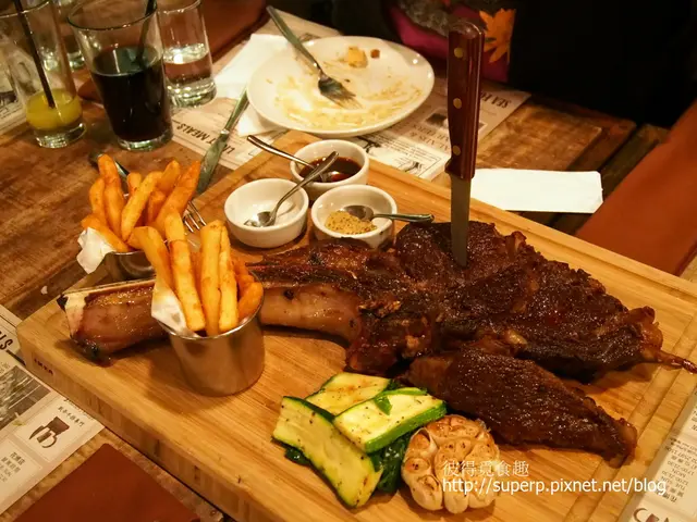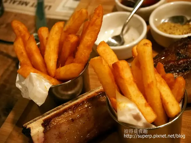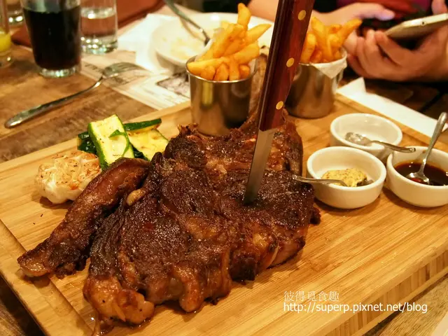 戰斧牛排(從旁邊的物品就可以看到這牛排有多碩大了。這牛排外脆內軟,應該是煎過再烤過的。裡面的肉汁豐沛極了,火候拿捏的非常好,肉質軟到不行,而且極為鮮美。薯條也是我喜歡的seasoned fries風格,夠味也酥脆。節瓜甜美,大蒜烤過後也很迷人。整體來說是大推!不過,沾料也值得一提。記得是有鹽,第戎芥末醬,以及特製醬汁。個人很愛沾第戎芥末醬,其酸味跟肉類很搭配。只是,那個特製醬汁,味道太特別了。怎麼說呢,我跟友人都覺得,如果家裡有養狗,對那個味道聞起來會很熟悉。BJ4了XD 反正我跟友人基本上沒碰那個醬汁)