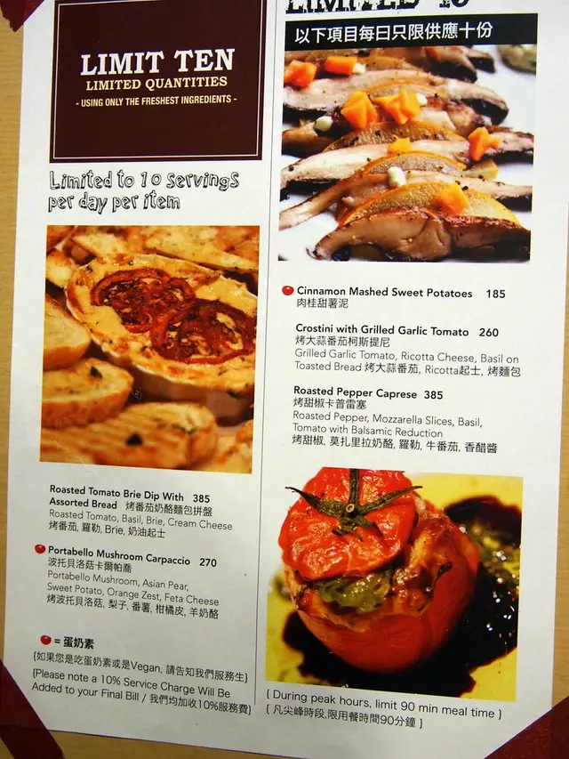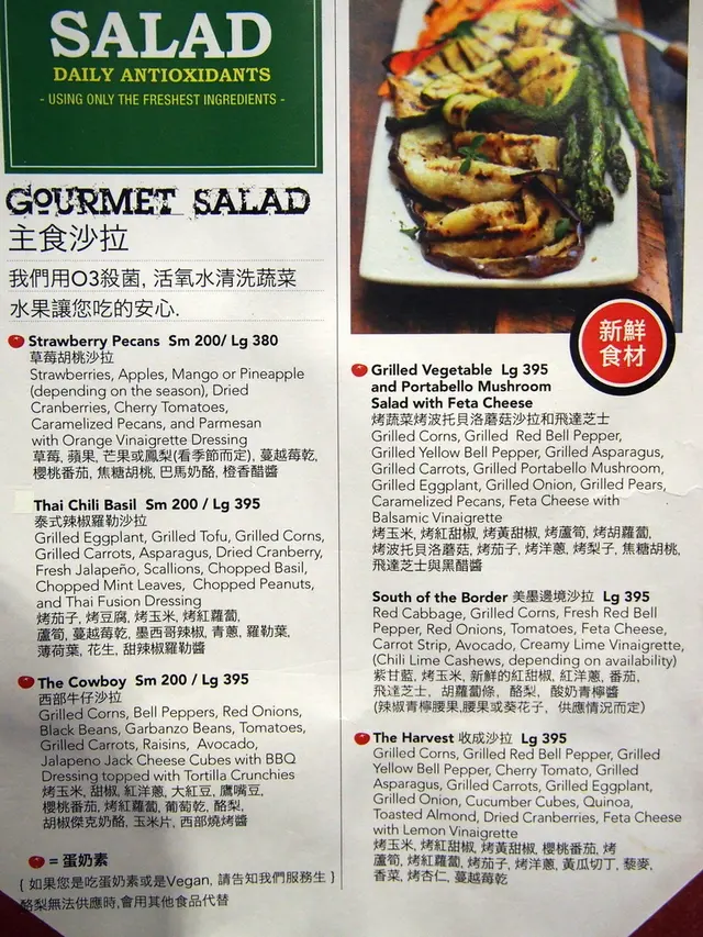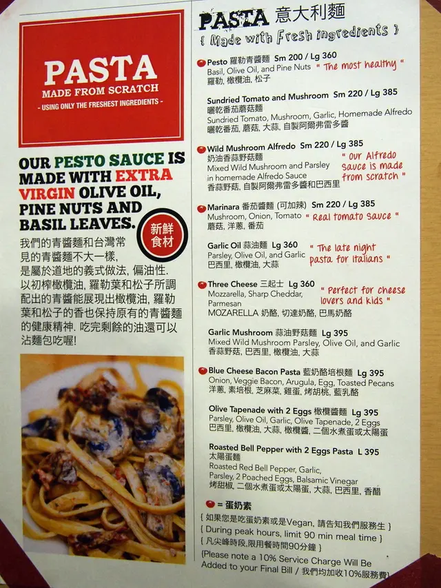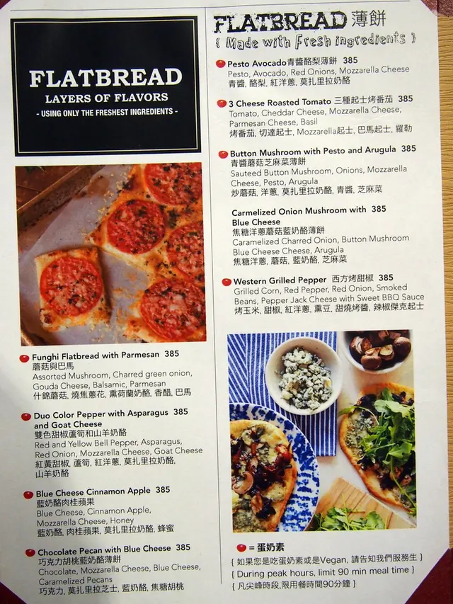 來這邊要點對東西。個人會避開脆皮烤什錦蔬菜薯條跟香蒜野菇,而對於他們的蘿勒青醬義大利麵印象也不深。自己斟酌一下吧XD