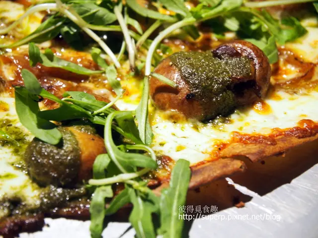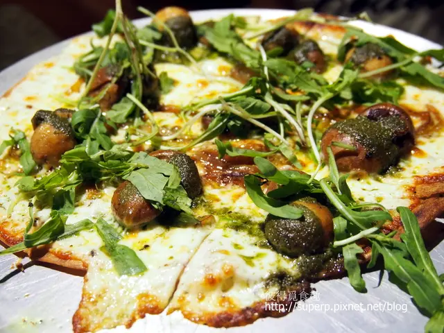 青醬蘑菇芝麻薄餅$385(薄餅酥脆,青醬鹹香,蘑菇爽口,搭配芝麻葉,好吃,接近大推!)