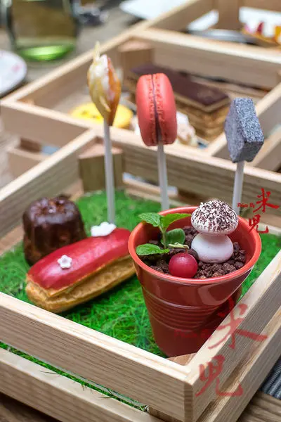 用特別訂製的木盤子上桌,每個木盤子底下都有主題,一個是石頭、一個是青草、一個是木,而師傅也別出心裁地用這三種元素為發想,做出兼具美色與美味的下午茶點心來!