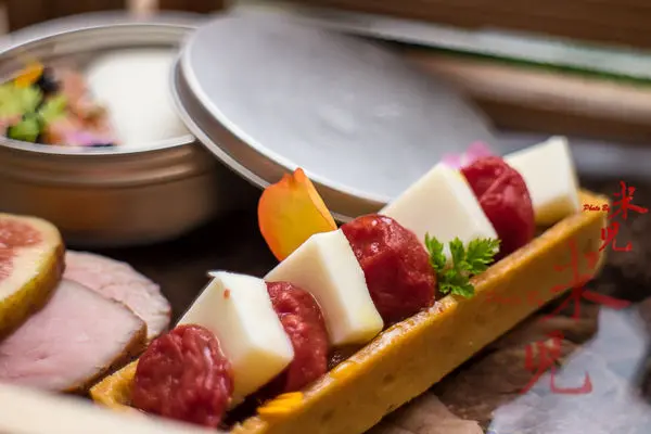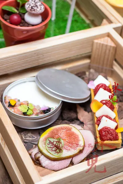 名為「石」的木盤子裡則盛裝了法式鹹甜CANAPE,有無花果鴨胸、番茄乳酪塔和燻鮭魚塔塔佐優格起司,因為做得太美,看起來就像甜點似的!讓人看著就很開心~~